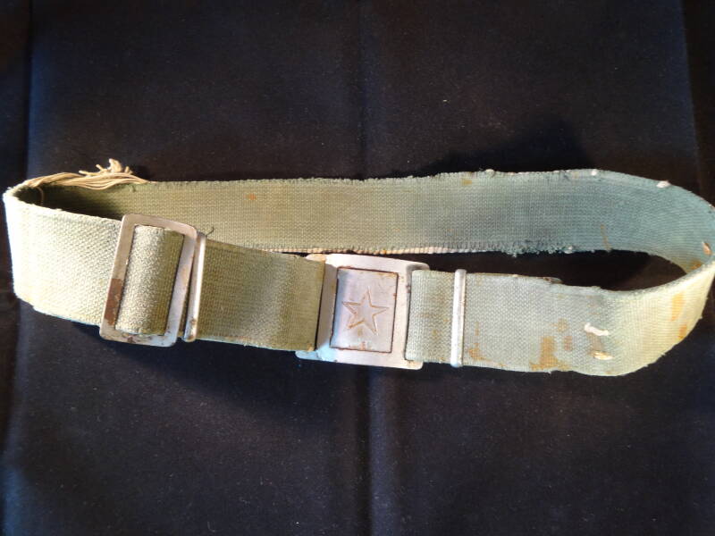 Hieronder de brede limoengroene riem in webbing-materiaal met grote in elkaar sluitende gesp met ster, die was gebaseerd op de vroegere standaard en meer smallere versie. Dit type buitgemaakt koppelslot werd tijdens de oorlog, onder de Amerikaanse militairen in Vietnam, voor bedragen tot maar liefst $100 toenmalige USD onderling verkocht. Omgerekend naar de huidige actuele waarde (2021) is dat om en bij de $650 USD!