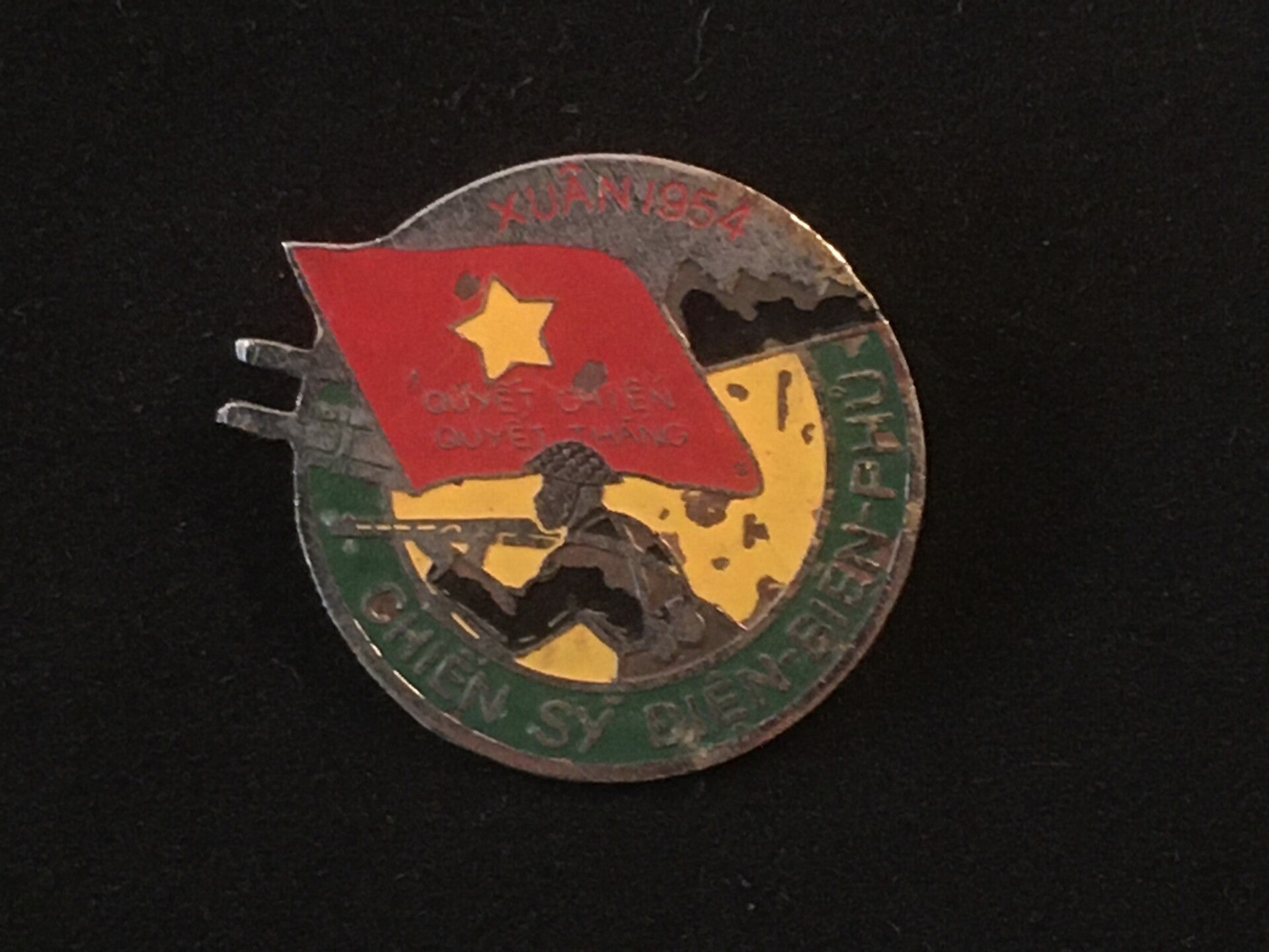 Onderaan het embleem staat vermeld: CHIEN SY DIEN-BIEN-PHU (Soldaat van Dien Bien Phu). De vlag van de DRV (Democratische Republiek Vietnam) vermeld onder de gele ster: QUYET CHIEN/QUEYET THANG (Beslissende veldslag/Vastbesloten om te winnen). Bovenaan het embleem staat XUAN (lente) 1954 gegraveerd. Twee types van afmetingen van dit embleem bestaan. Deze versie is het kleine type, dat ongeveer 25 millimeter meet. Het type pin wijst er op dat het hier om de vroegste uitvoering moet gaan.